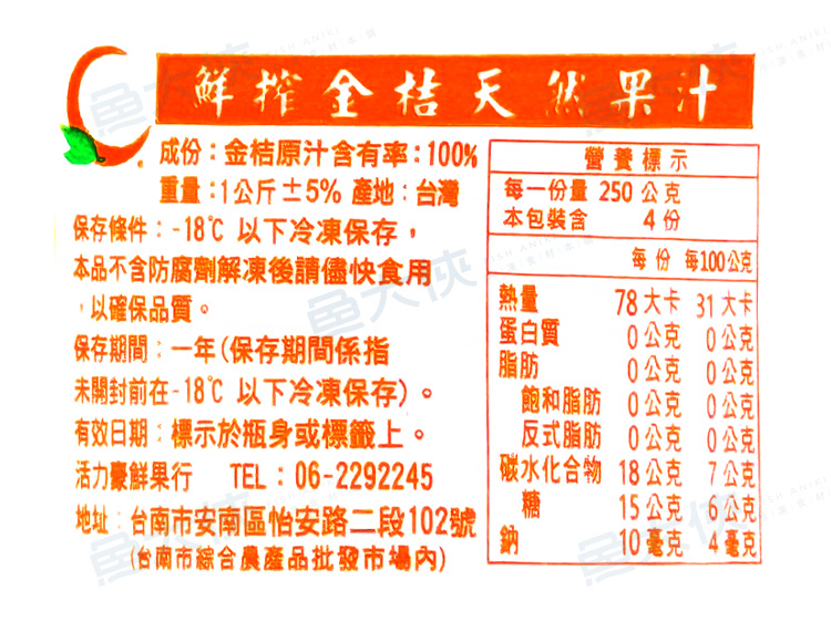 目前位置: 首頁 > 即食調理 > 解凍/覆熱即食 > 金桔原汁(970cc/瓶)-1A2B【魚大俠】AR057
