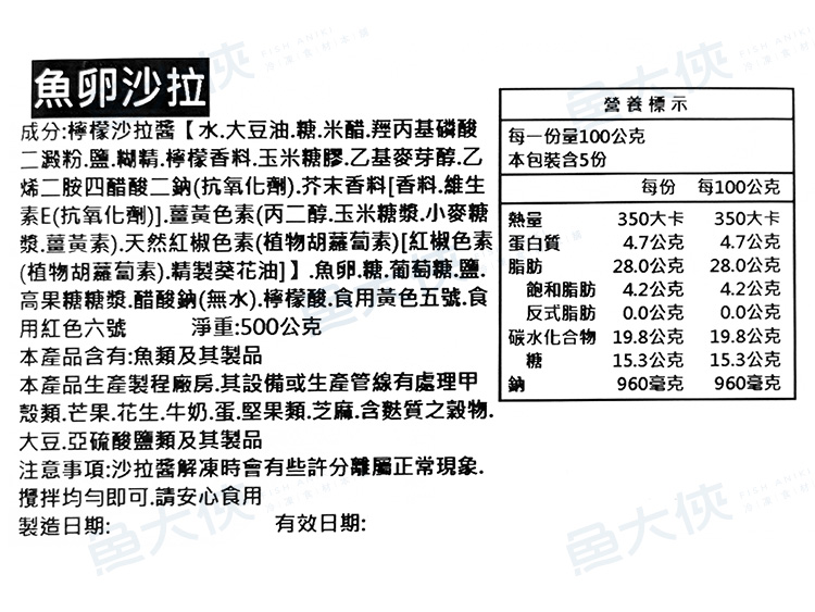 | 這次買了魚卵沙拉~~發現是甜的(有橘子味)上了蘭陽食品查~~好像叫檸檬魚卵沙拉~~~看要不要在介紹改一下說明~~~我現在都混著桂冠沙拉來吃比較不那麼甜~~~~ | |||